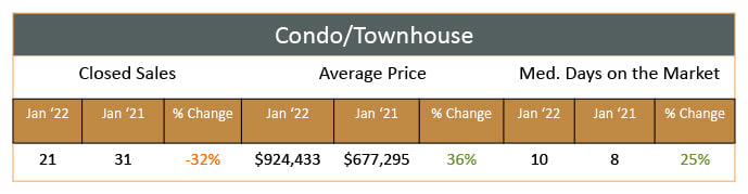 Closed sales decreased -35% from December from 133 to 86 homes sold. This is down -32% from January 2021.